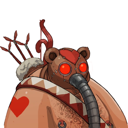 The Flame Archer wears a teddy bear head as a substitute for the normal head attire the Raiders normally wear, and the most noticeable part of his appearance is his nipples, which have been pierced with rings. Because he wears no shirt, his chest hair roams free. He has a red heart tattoo on his right arm and wears a sling across his body that carries his arrows and bow.